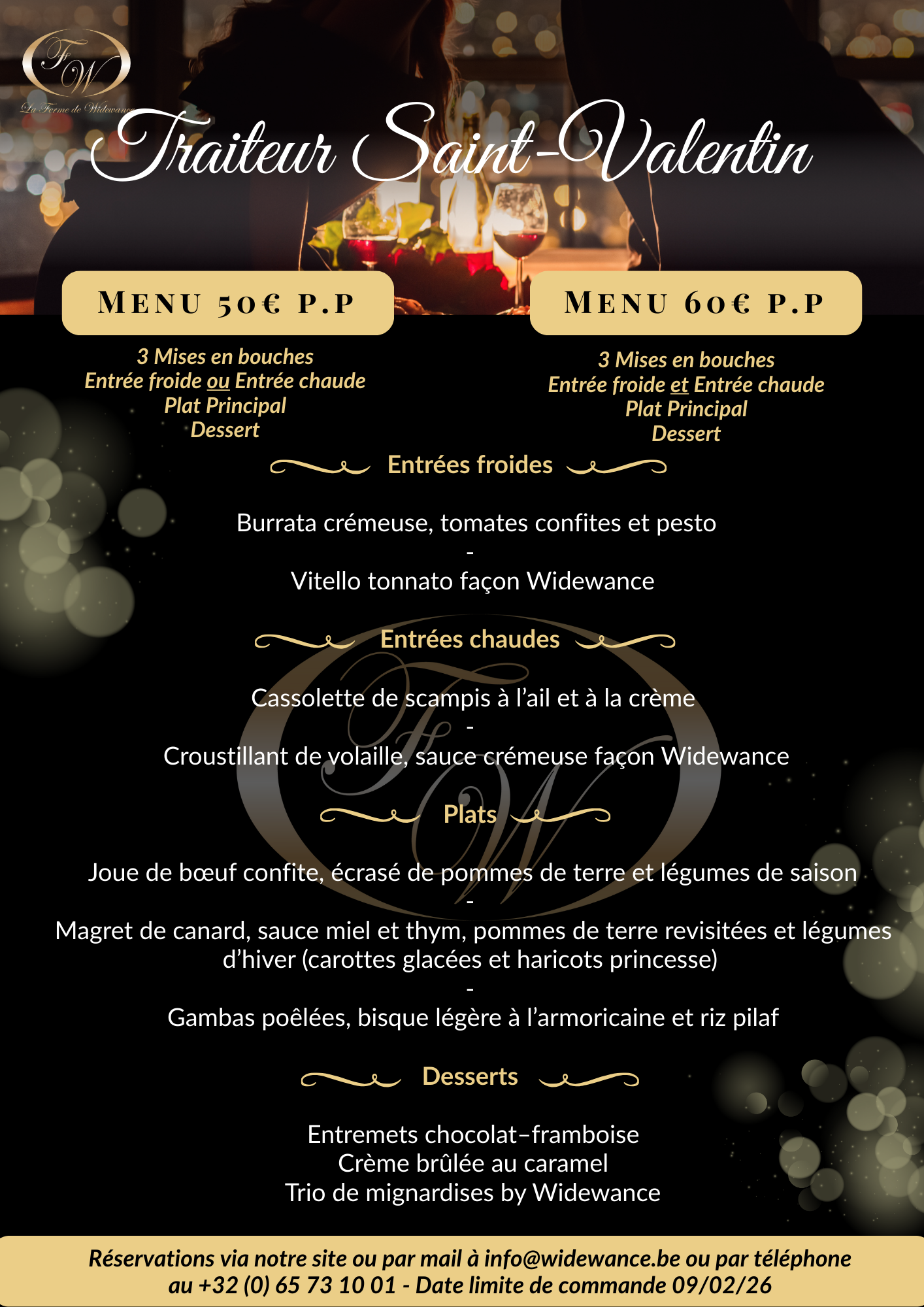 Pour la Saint-Valentin, La Ferme de Widewance vous propose un menu traiteur raffiné à emporter, pensé pour partager un moment gourmand et romantique à la maison.